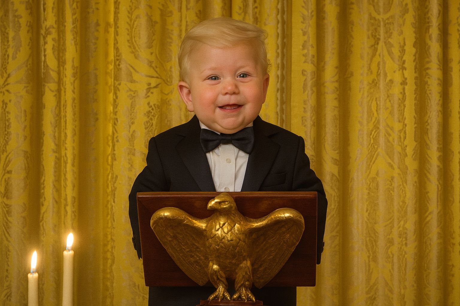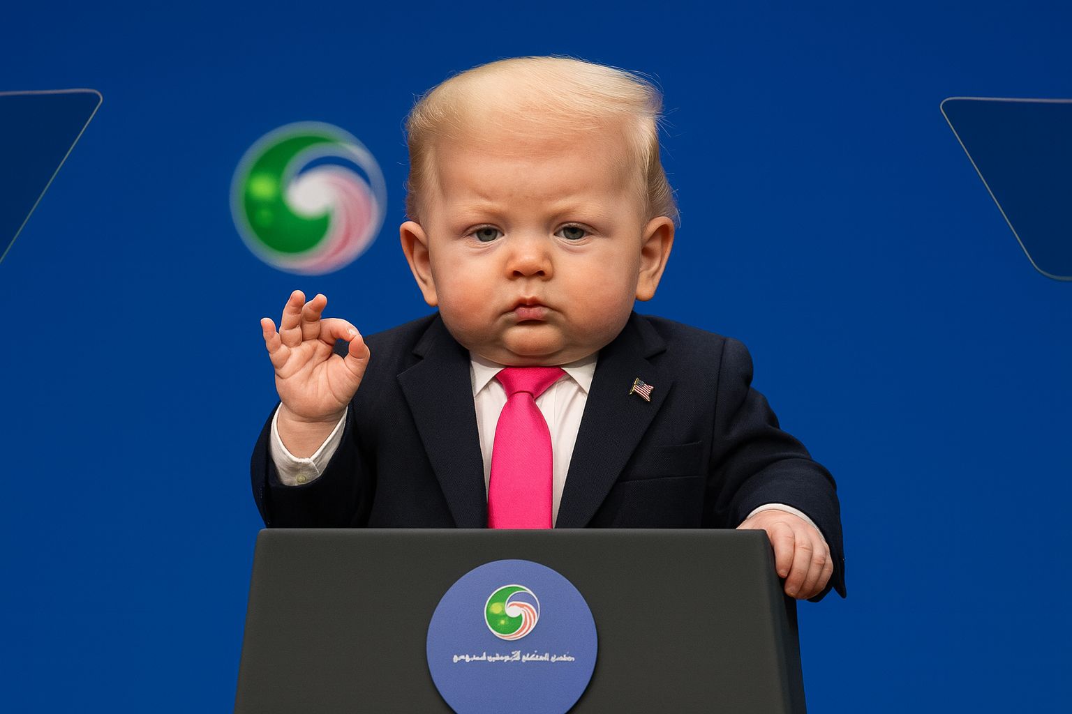 Then Trump toddled to the mic, admiring the “great group of people” and calling America “the hottest country anywhere in the world.” He thanked his “friend,” praised last night’s tiny party, and promised a bigger room next time—classic toddler move: promise a bigger fort.